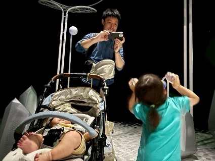 大阪・関西万博のパビリオン内で、娘たちの写真を撮る箱谷真司さん