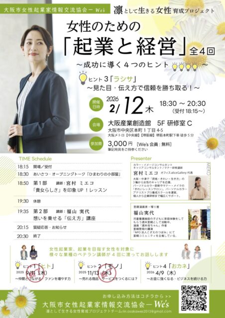 大阪市女性起業家情報交流協会~We’s が贈る「Next Stage Women’s Lab」は、凛として生きる女性育成プロジェクトとして毎回テーマを変えて、女性の挑戦を応援する全4回のプログラムです。