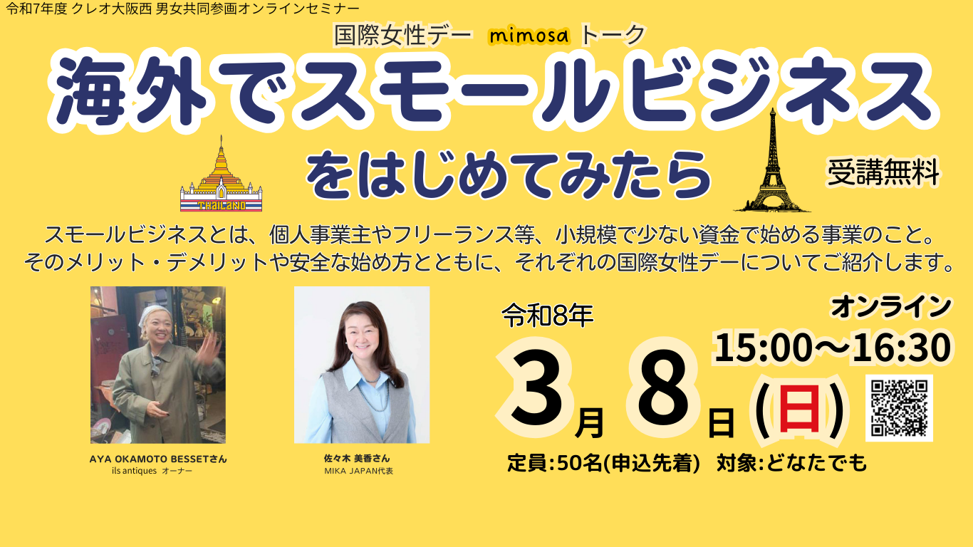 | 申込方法 | クレオ大阪西窓口、電話(06-6460-7800)、 下記のクレオ大阪西ホームページ 「セミナー・講座に参加する」より |